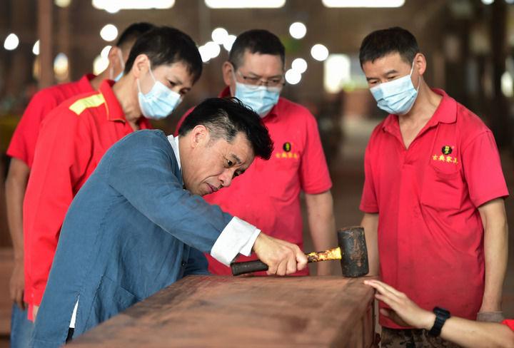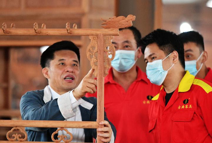 在位于福建莆田的古典家具生产车间里,陈玉树(左一)在给主创团队成员讲解木作传统技艺的视觉之美(6月10日摄)。新华社记者 魏培全 摄