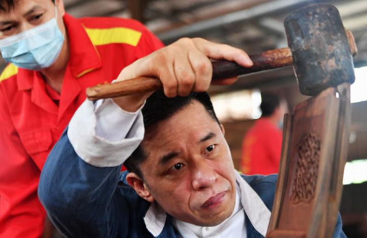 陈玉树(右)正在拼装大红酸枝圈椅的椅背(6月10日摄)。新华社记者 魏培全 摄