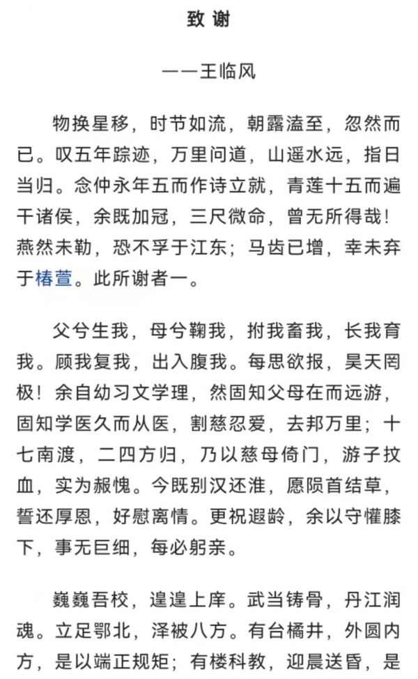 修习麻醉学专业的王临风用仿骈体文记录了他在湖北医药学院学习生涯中遇到的人、发生的事,并分别致谢人生、致谢父母、致谢母校、致谢师长。