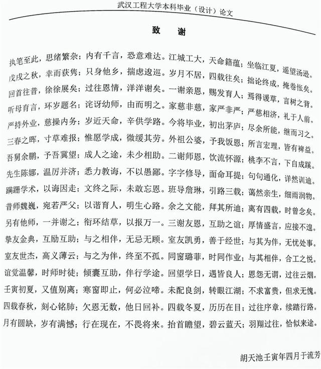 广告设计专业的胡天池以对仗工整、运典自如的文风,细数了成长、求学路上的感怀、感恩。胡天池表示,这篇致谢是他花了一下午的时间完成,没有刻意雕琢,文体形式只是辅助。“青春对每个人都很珍贵,我就是想在毕业的时候留下些什么,将来回忆起来应该很有成就感。”