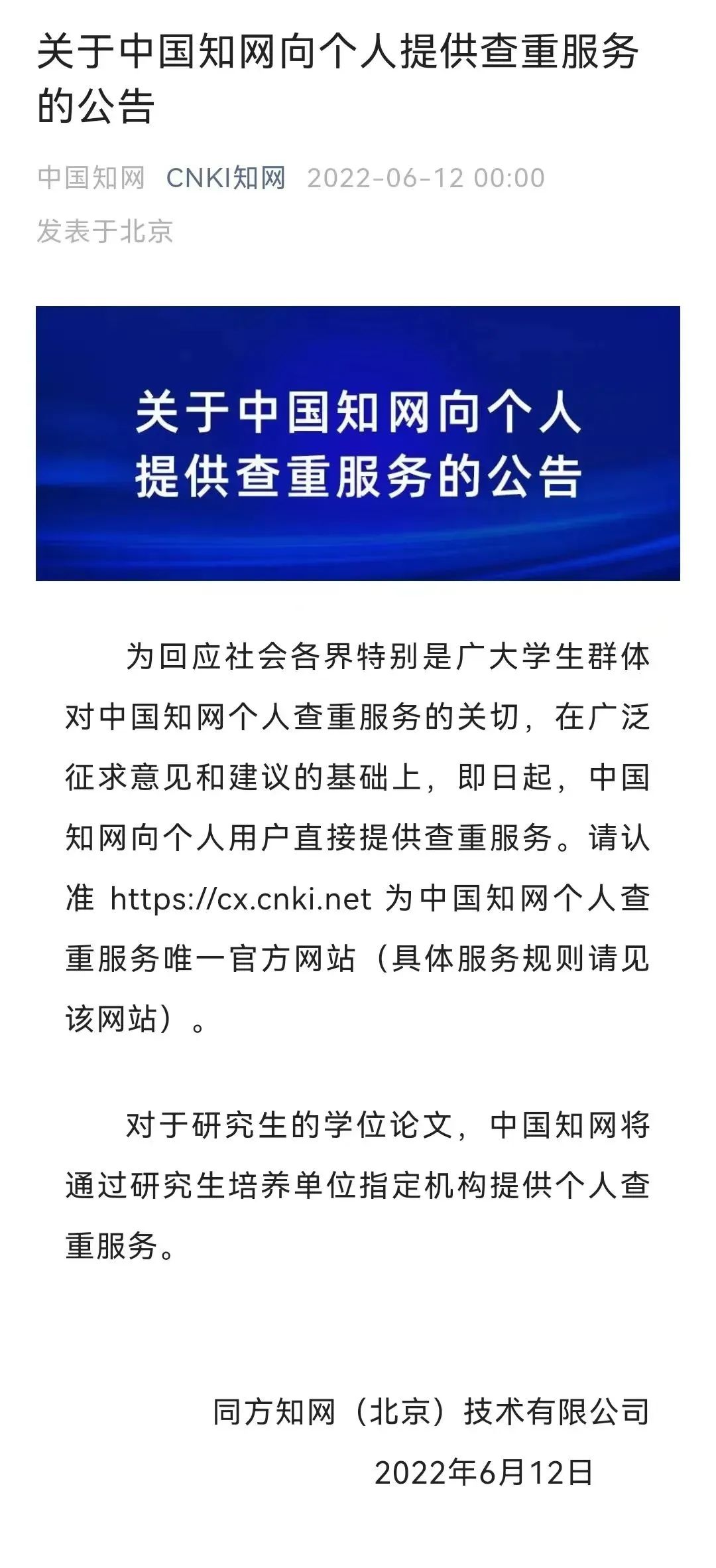 12日凌晨,中国知网在其官网微信公众号上发布《关于中国知网向个人提供查重服务的公告》,表示即日起,中国知网向个人用户直接提供查重服务。