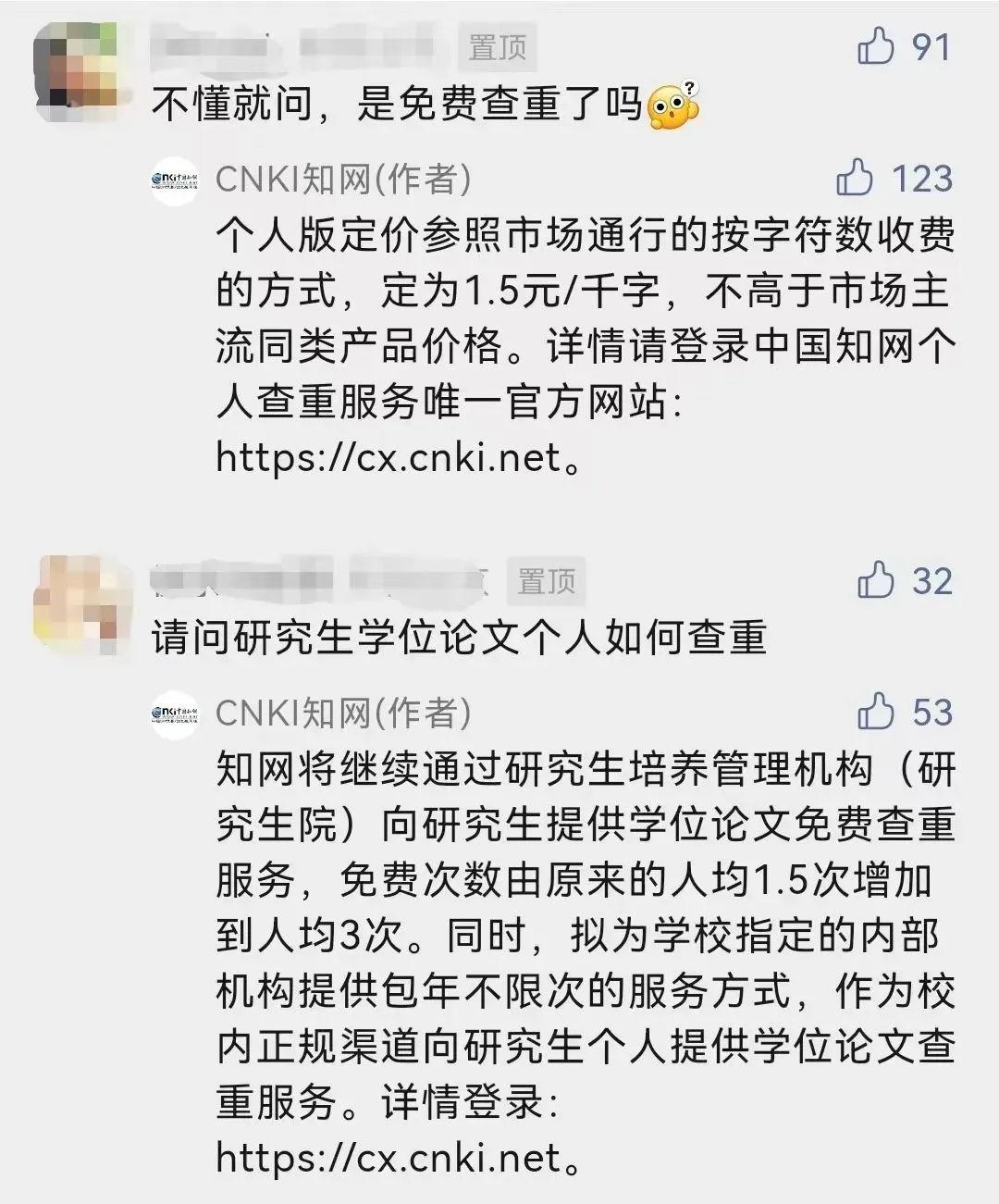 知网将继续通过研究生培养管理机构(研究生院)向研究生提供学位论文免费查重服务,免费次数由原来的人均1.5次增加到人均3次。同时,拟为学校指定的内部机构提供包年不限次的服务方式,作为校内正规渠道向研究生个人提供学位论文查重服务。