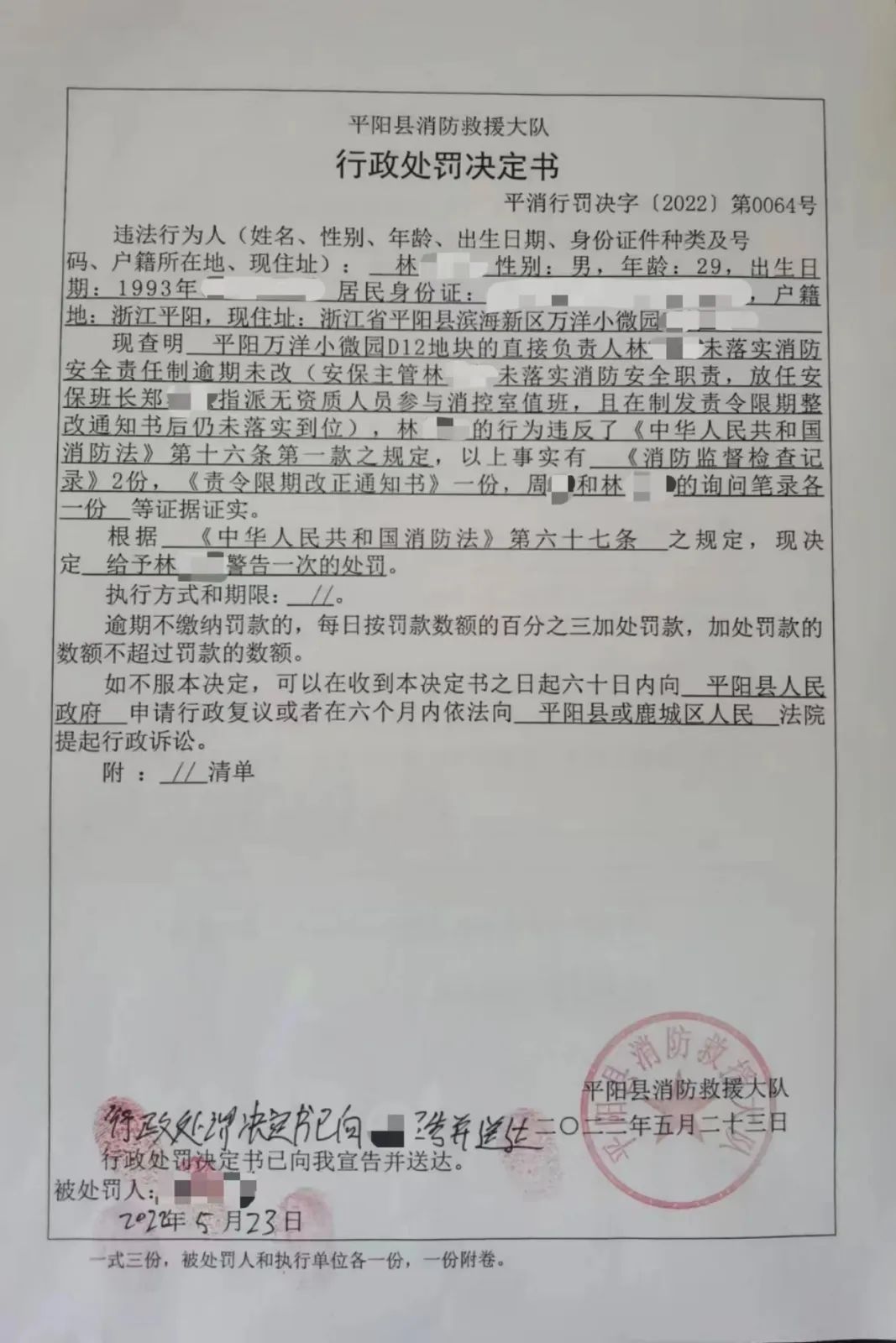 5月31日,公安机关根据《中华人民共和国消防法》第六十四条第(一)项之规定,对违法行为人郑某某处以行政拘留十二日的处罚。平阳县消防救援大队对物业主管、公司主要负责人林某某、周某给予行政警告处分。