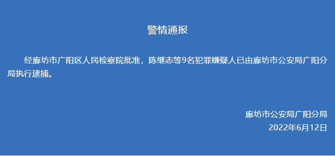 2022年6月12日,廊坊市公安局广阳分局发布通报,经廊坊市广阳区人民检察院批准,陈继志等9名犯罪嫌疑人已由廊坊市公安局广阳分局执行逮捕。