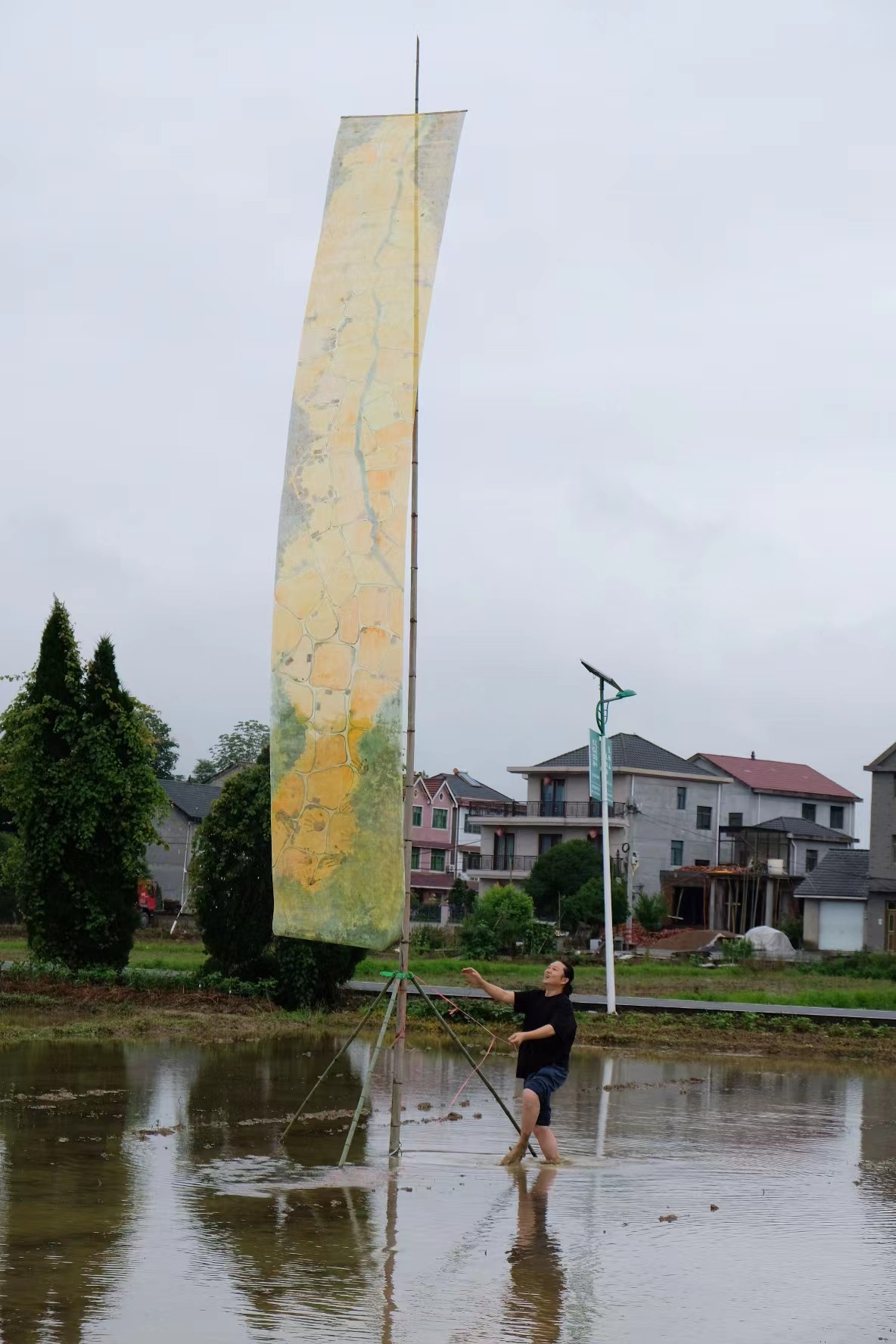 田埂上,一幅幅风雨旗似乎在为辛勤劳作的人鼓劲——这是“稻田艺术节春社活动”的一部分。主办方邀请各界友人,以稻田祈福为主题,共同创作24幅风雨旗。这些旗帜将在稻田上飘扬一整个夏天,直至秋收。正如周华诚在“父亲的水稻田”研学手册扉页所言:“双脚踩在泥巴里,俯身在田地间劳作,感受风雨阳光,感受艰辛劳累。在这个过程中,你将会有很多细微的发现,这将带给你欣喜。愿你能经常想起这片水稻田,同时,让我们一起来期待一场秋天的收获。”
