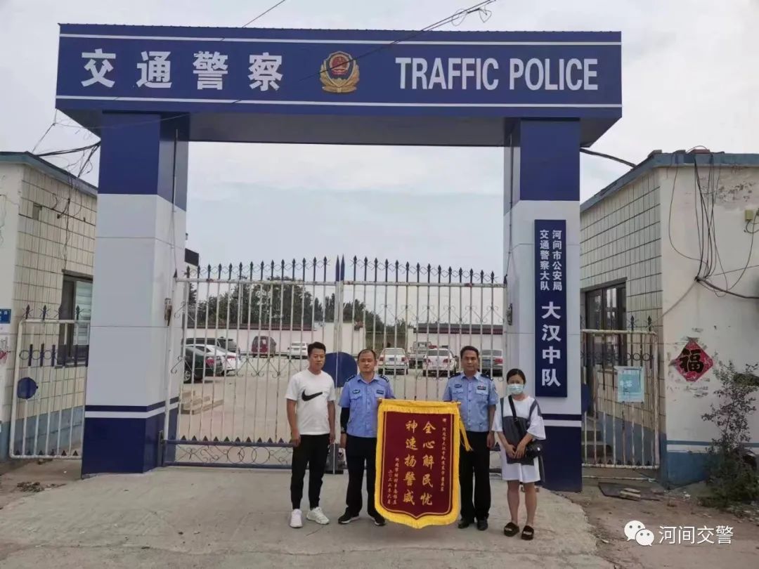 2022年6月10日,河间市时村乡南杨庄村王某与妻子来到河间市公安交警大队大汉中队,将一面写有“全心解民忧 神速扬警威”的锦旗送到交警手中,表达对交警帮助快速处理交通事故的感激之情。