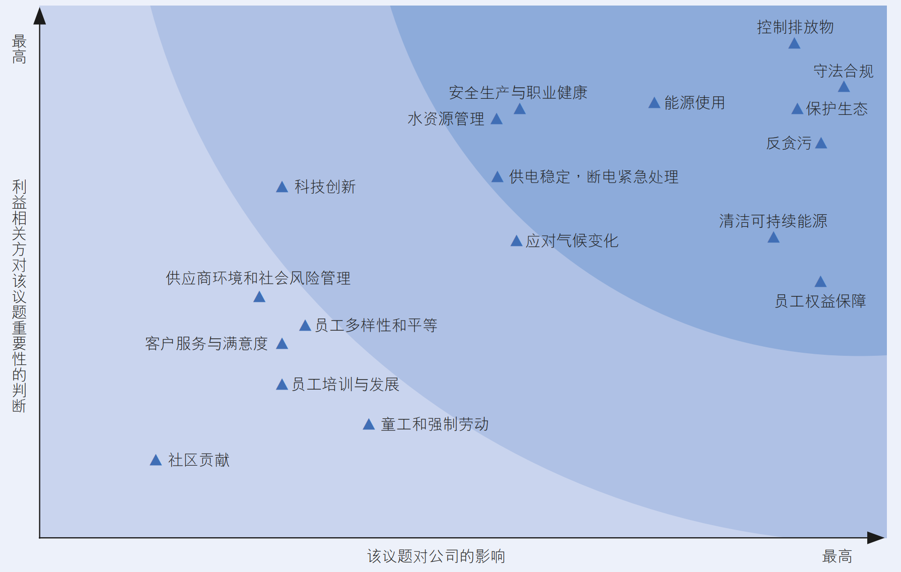 华能国际将所有议题放在一张矩阵图中,其中重要性排在前列的10项议题分别为控制排放物、守法合规、保护生态、反贪污、能源使用、清洁可持续能源、安全生产与职业健康、水资源管理、供电稳定及断电紧急处理、员工权益保障。