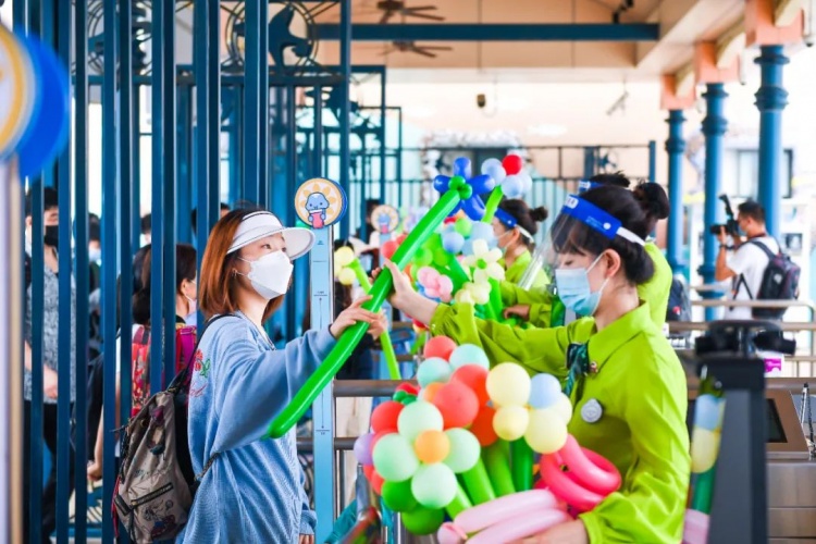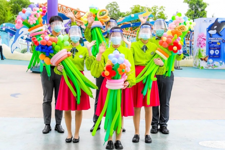 上午9点,上海海昌海洋公园迎来了恢复常态化运营后的首批游客,大家在现场工作人员的引导下有序入园。园内的巡演人员也已等候多时,以热情的歌舞迎接游客们入园游玩。