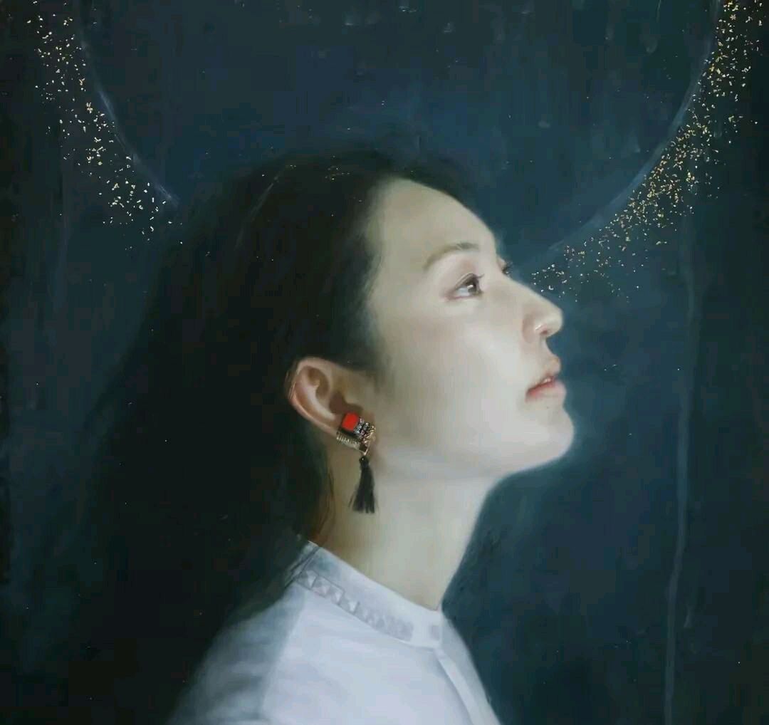 伊势田理沙的画中有的女人躺着仰望天空,有的女人拨开窗帘向窗外俯视,有的女人站着略微抬头看星空等等,总之形态各异,然而每一种肢体动作,都表露出来的很沉静的一种表情。