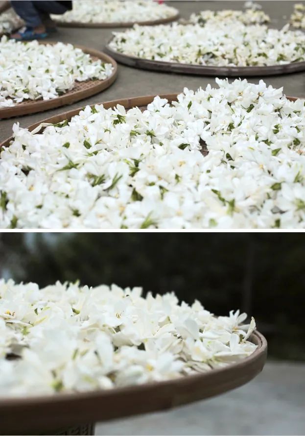 100斤的茶叶再下5斤栀子花来提香,茶花融合三小时,再人工将花一朵朵挑出来......