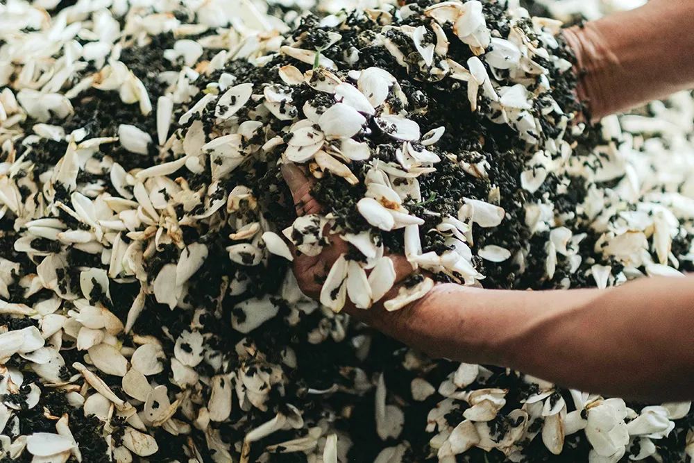 因为栀子花的花蕊显微酸性,花萼带苦涩味,在制作的时候需要手工摘除花萼与花蕊,只留下白的花瓣用来窨茶。