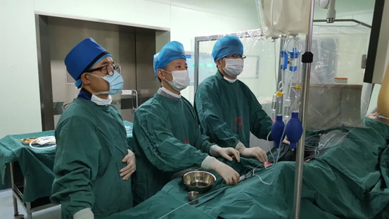 胡伟主任及团队成员自2015年开展急性基底动脉闭塞的血管内治疗等相关手术及临床研究。血管内治疗对于急性基底动脉闭塞是一种特色的手术治疗方式。从股动脉切口穿刺入路,通过一系列特殊的装置将血栓从基底动脉取出或支架血管成形,从而使得基底动脉血流再通,恢复脑干、丘脑以及小脑等脑组织的血流灌注。