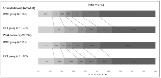 ATTENTION登记研究旨在探究对于发病24小时内的急性基底动脉闭塞患者,血管内治疗(EVT)相较最佳药物治疗(BMM)是否具有更佳的功能预后。本研究共纳入2134位患者,EVT组和BMM组分别有1672人和462人进行分析。研究人群的中位年龄为65岁,基线NIHSS评分为21分,发病到入院的中位时间约为5.6小时。在EVT组和BMM组分别有40.4%和28.5%的患者达到90天改良生活质量评分(mRS)0-3分(P<0.001)。研究结果证明急性基底动脉闭塞血管内治疗显著优于药物治疗。此外,血管内治疗还能够明显降ABAO患者90天的死亡率(EVT36.9% vs BMM 47.5%)。