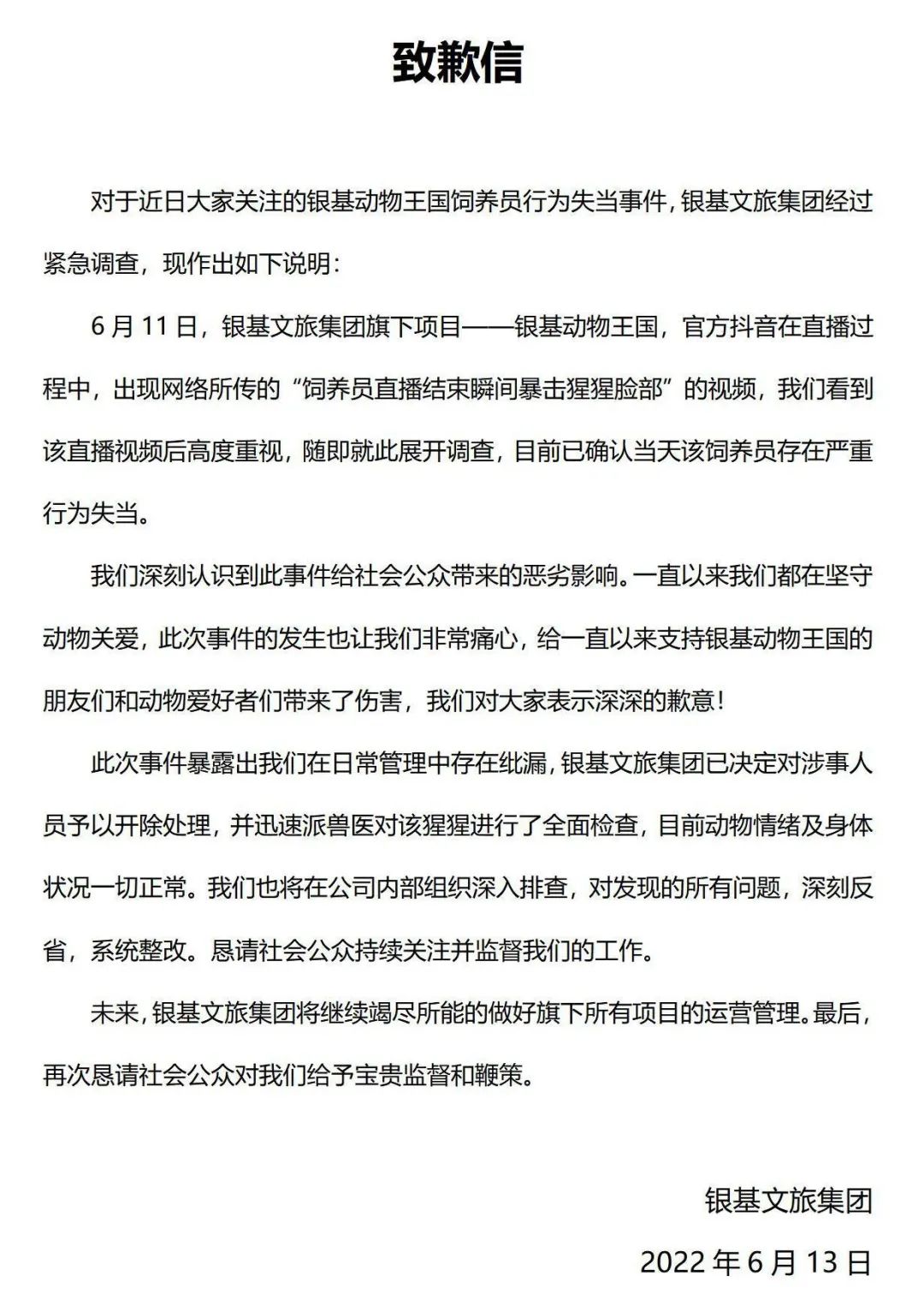 银基文旅集团13日发布致歉信称,6月11日,银基文旅集团旗下项目——银基动物王国,官方抖音在直播过程中,出现网络所传的“饲养员直播结束瞬间暴击猩猩脸部”的视频,该集团看到该直播视频后高度重视,随即就此展开调查,目前已确认当天该饲养员存在严重行为失当。银基文旅集团已决定对涉事人员予以开除处理。