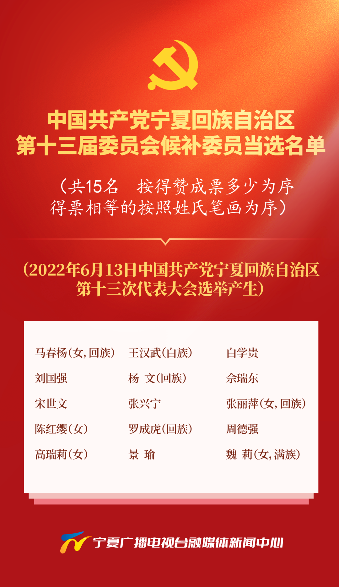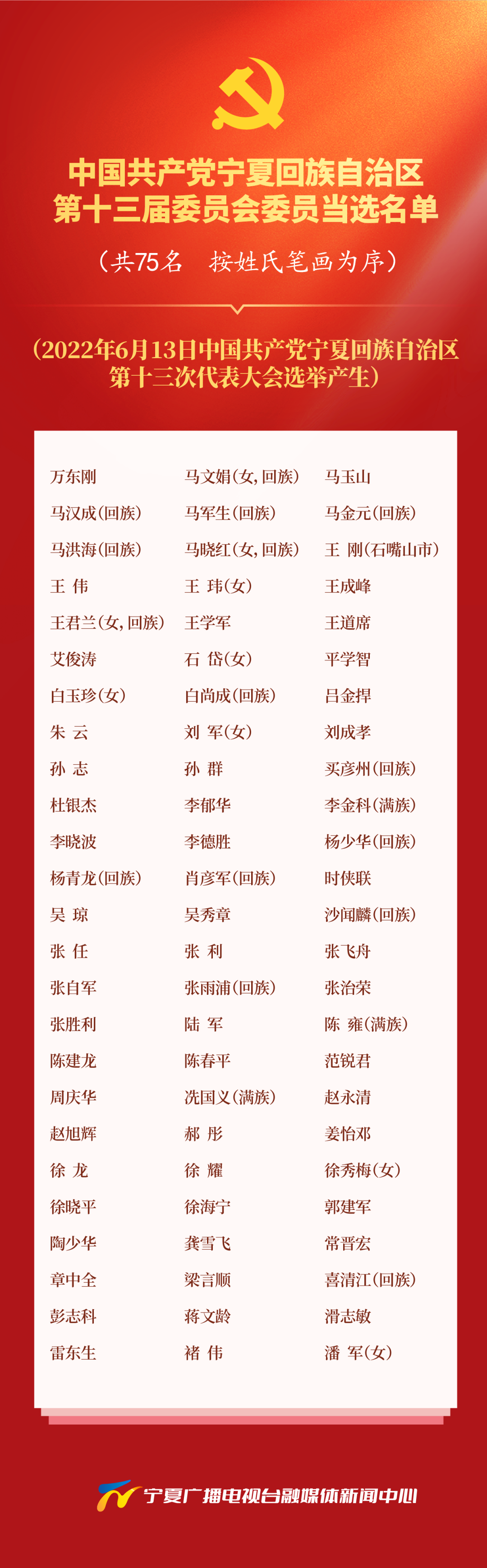 中国共产党宁夏回族自治区第十三届委员会委员、候补委员当选名单