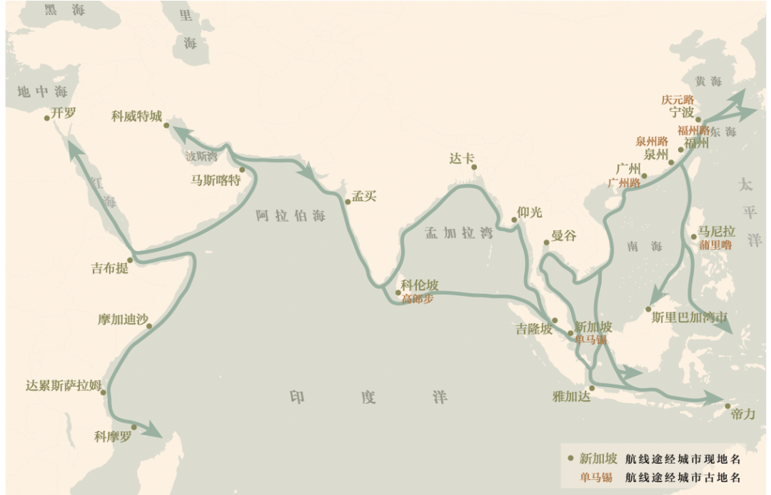 “海上丝绸之路”的主要航线及途径的重要港口城市。图源 |《给孩子的中国国家地理》