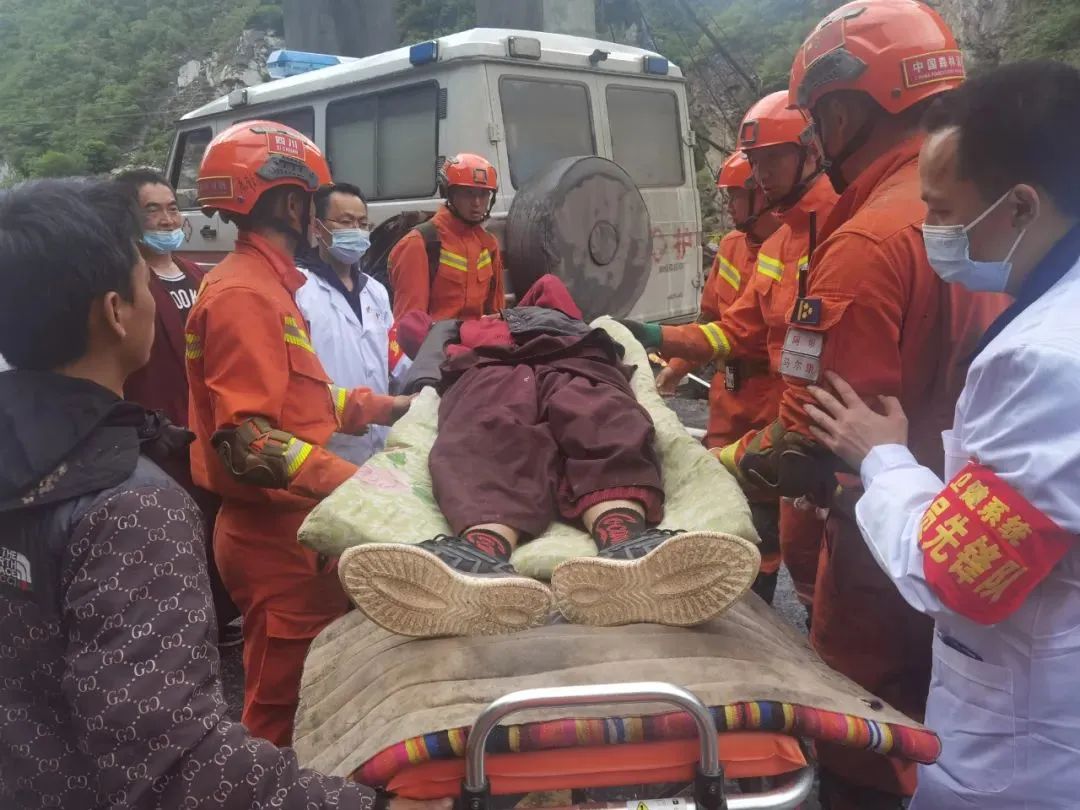 从斯拉尔底村到山脚,受地震影响,原来的水泥路被滚石水流淹没,几乎没有路可走。10名消防救援人员采取四人抬架的方式,轮流将伤者抬下山。趟河越石,一路上滚石不断,救援人员派出一名安全观察员,以防落石砸伤。19时许,终于将伤者送至山脚,在医护人员检查后将其送上救护车。上车前,仁卓紧紧拉住消防员宋海峰的手说道“感谢消防员,是你们救了我。”目前,伤者已被送至马尔康市区医院进行进一步检查与治疗。