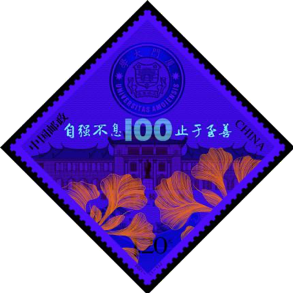 邮票采用中轴对称的构图形式,结合紫色与金色的互补色调,烘托了百年校庆的庄重与辉煌。