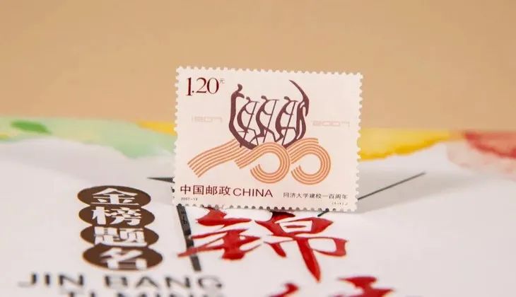 邮票以同济大学校徽中的“三人划龙舟”图案点缀由水纹组成的“100”校庆校徽图案。
