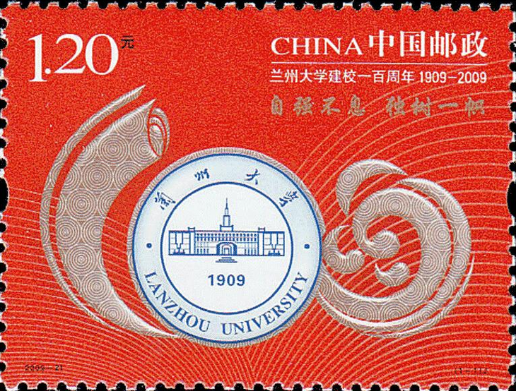 邮票采用深蓝色兰州大学的校徽原图做主图,辅以火炬等图案,形成“100”的字样,整体洋溢着书卷文化气息。