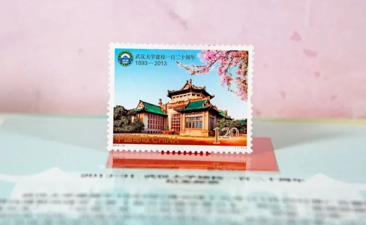 邮票以中西合璧宫殿式的武大老图书馆为主体,青色的琉璃瓦,腾飞的屋檐,将自然环境与人文底蕴高度融合。
