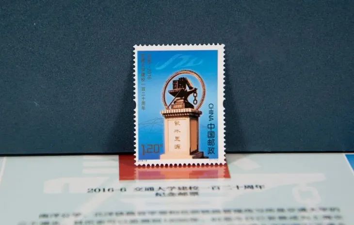 邮票以铸有交通大学校徽的“饮水思源”纪念碑为主图,背景的蓝色渐变彰显交大人海纳百川、放眼世界的胸怀和抱负。