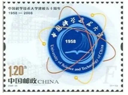 邮票以深蓝色的科大校徽为主图,形象地将校徽比作原子核,周围绕以金色的原子运动轨迹,进一步强调了科大的学校性质和建校50年来所走过的光辉。