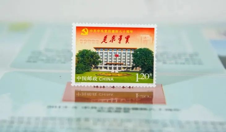 纪念邮票主图为党徽、中共中央党校的新大楼与旧址、毛泽东亲笔题写的校训“实事求是”。邮票正上方为“中共中央党校建校八十周年”几个大字。