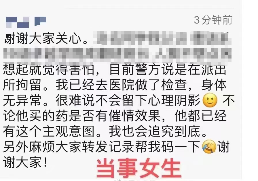此前,被投异物的女生聊天记录截图显示,其表示“不论他买的药是否有催情效果,他都已经有这个主观意图。”