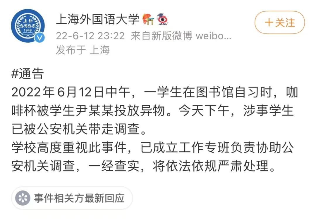 近日,上海外国语大学一名男生在图书馆向一名女生的饮料中投入不明物一事,引发广泛关注。