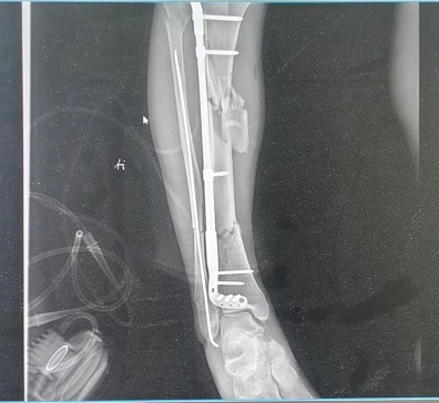 接诊的骨科医生贾炬川为周先生检查,发现患者右腿胫骨、腓骨多处骨折,小腿骨头断为7截,伤情严重,如果恢复不佳,可能会导致小腿短缩、旋转、畸形等情况。经过初步清创、止血等处理后,周先生被收治入院等待手术。由于患者是开放性骨折,断骨戳破皮肤,可能造成感染,还要先控制感染后,才能为其进行手术。术中,肖飞医生小心翼翼地为患者复位骨折部位,并用钢板钢钉固定。目前,周先生术后恢复良好,出院后经过一段时间的康复训练,不会影响正常生活。(长江日报记者武叶 通讯员陈梦圆 周丽)