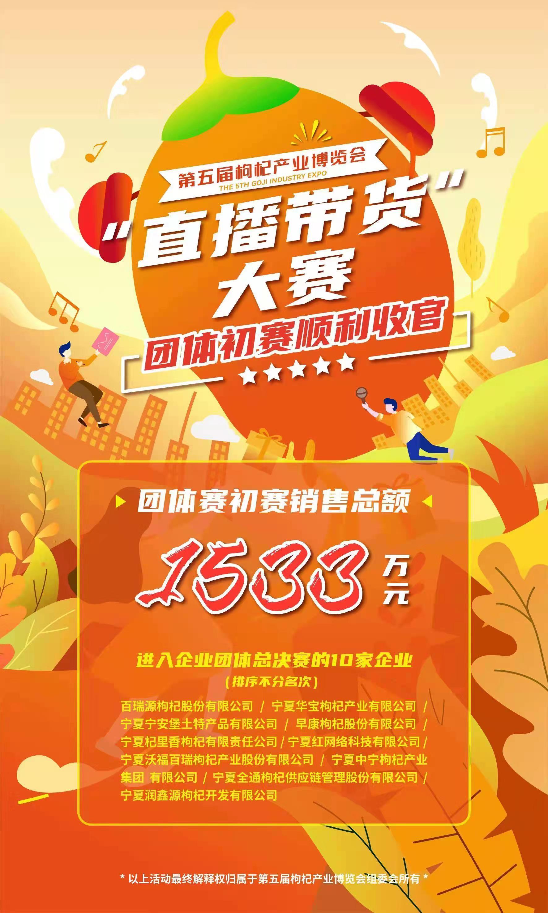 为全面落实国务院和自治区关于稳经济、保增长、促发展的有关部署要求,自治区林业和草原局、中卫市人民政府、中宁县人民政府,以第五届枸杞产业博览会为契机,在自治区商务厅的指导下于2022年6月3日联合举办直播带货大赛,共有30家企业报名参加本次大赛,19家企业正式参加比赛,经过10天的激烈角逐,团体赛初赛销售总额突破1千万元,实现了15338469.07元的直播销售额。
