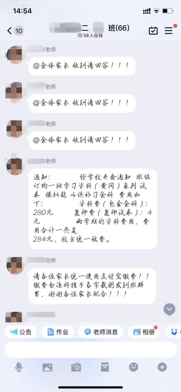 李女士是阳逻街某小学的学生家长,她介绍,1月5日下午上课时间,“语文老师”在群里发了一条消息,称孩子近期有资料费要收取,要求家长扫二维码缴费,每人284元。