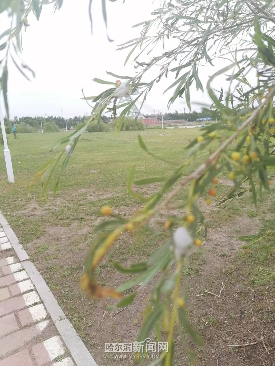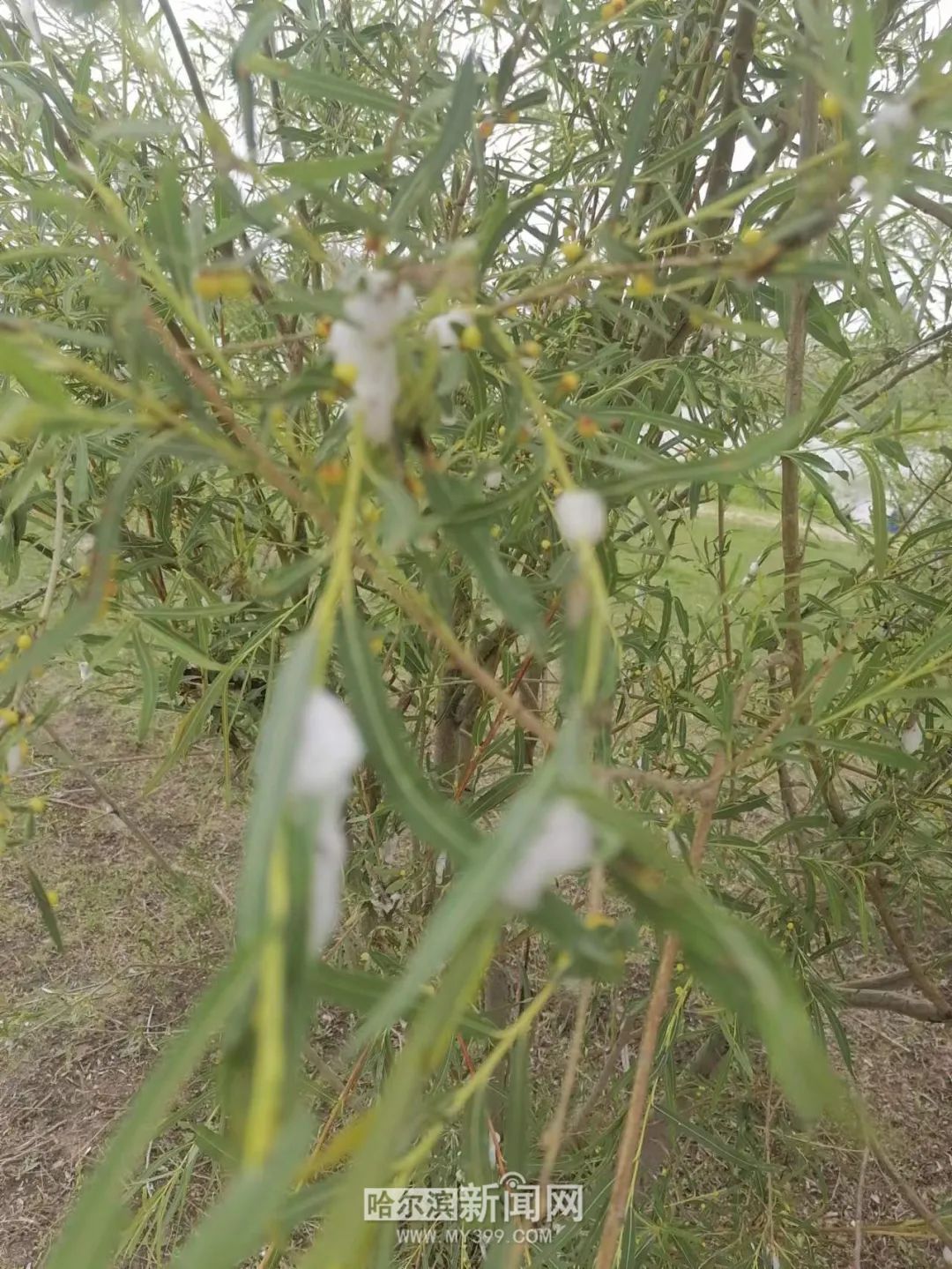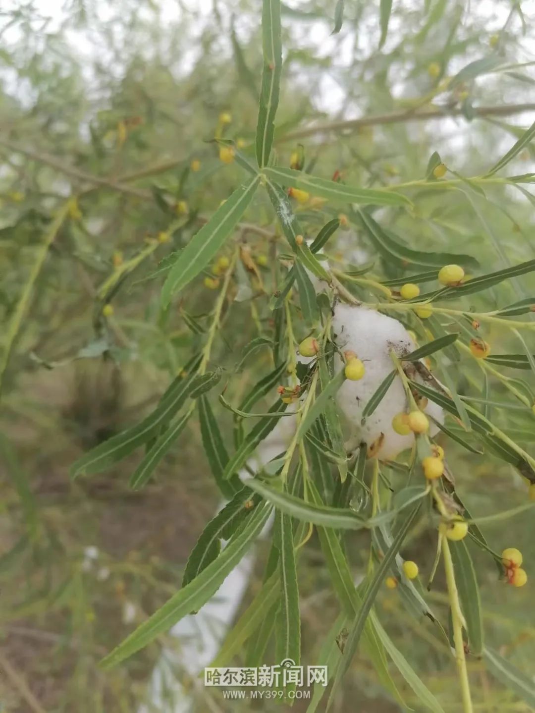 日前,有市民在松北区太阳岛湿地上的一些柳树上拍摄到了一组树枝长金豆的照片。照片显示,柳树枝条上长出了囊状小豆,还会冒出乳白色泡沫。园林专家介绍,这些小豆是柳瘿叶蜂的幼虫为自己“建造”的住宅,枝干上的泡沫也是它们的杰作。