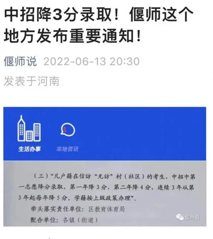 6月13日,河南洛阳,一份名为“某社区考生中招降分报名通知”的文件引发关注。网传文件显示,该社区为无访社区,户籍落在该社区的中招考生,第一志愿可降3分录取。
