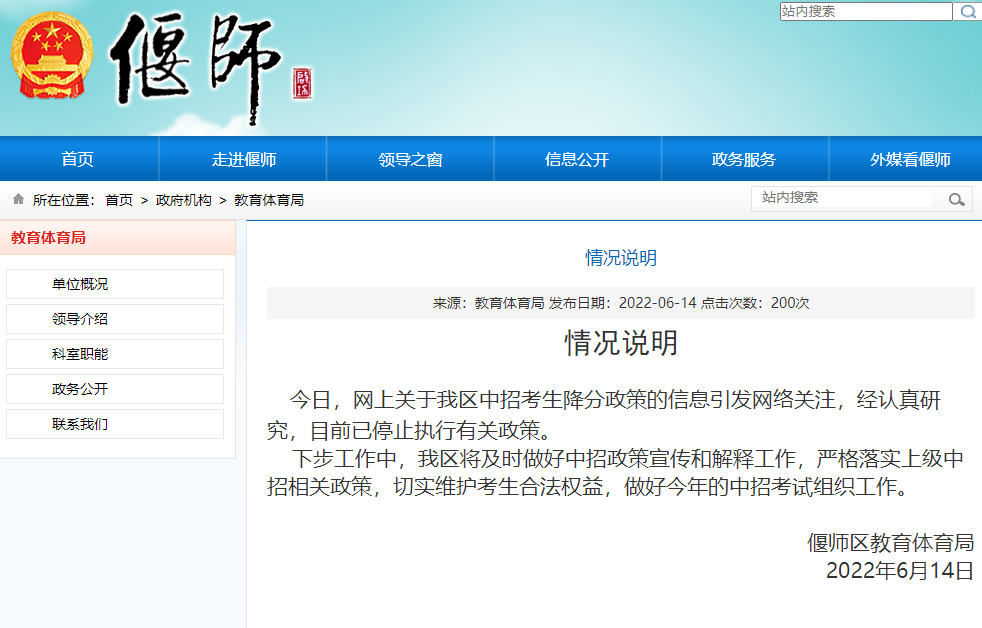 6月14日下午,河南省洛阳市偃师区人民政府官网发布通报:今日,网上关于我区中招考生降分政策的信息引发网络关注,经认真研究,目前已停止执行有关政策。