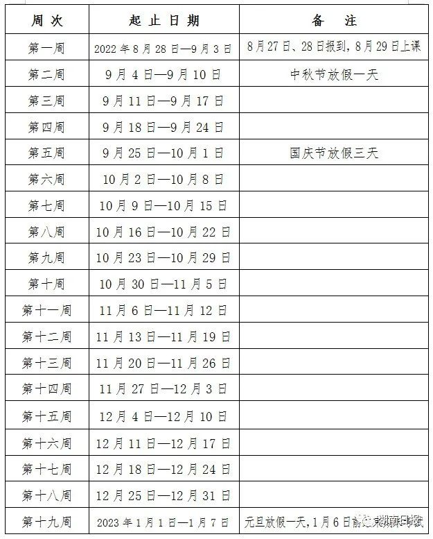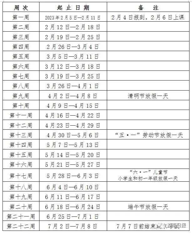 第一学期:2022年8月29日上课,2023年1月7日结束,全学期共19周,寒假从2023年1月8日开始,2月4日结束;第二学期:2023年2月6日上课,7月8日结束, 全学期共22周,暑假从2023年7月9日开始,9月2日结束。今日,记者从长沙市教育局了解到,长沙市普通中小学、职业技术学校2022学年度校历出炉,一起看看吧!