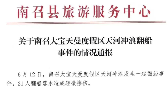 6月12日,南召大宝天曼度假区天河冲浪发生一起翻船事件,21人翻船落水造成轻微擦伤。