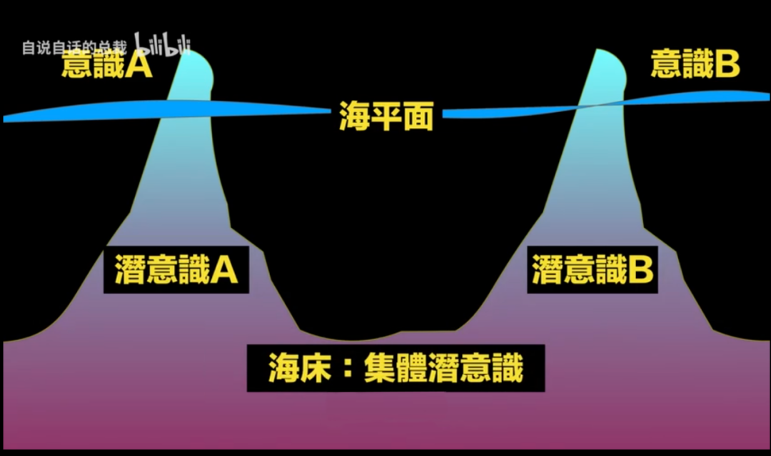 卡尔·荣格认为意识、潜意识并不是一座漂浮的冰山,而是从海床上生长出来的小岛,露在水面的意识只是1%,水下还有大量的潜意识与无边无际将所有潜意识和意识连接的海床——集体潜意识。