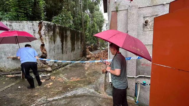 接报后,民警立即赶往现场处置。原来受近期连续降雨影响,该路段两米多高的围墙不堪侵袭,倒了下来,泥块散得到处都是,所幸无人员受伤。通过仔细观察,民警发现有些未倒塌的围墙已经出现很大的裂缝,随时有再次倒塌的风险。