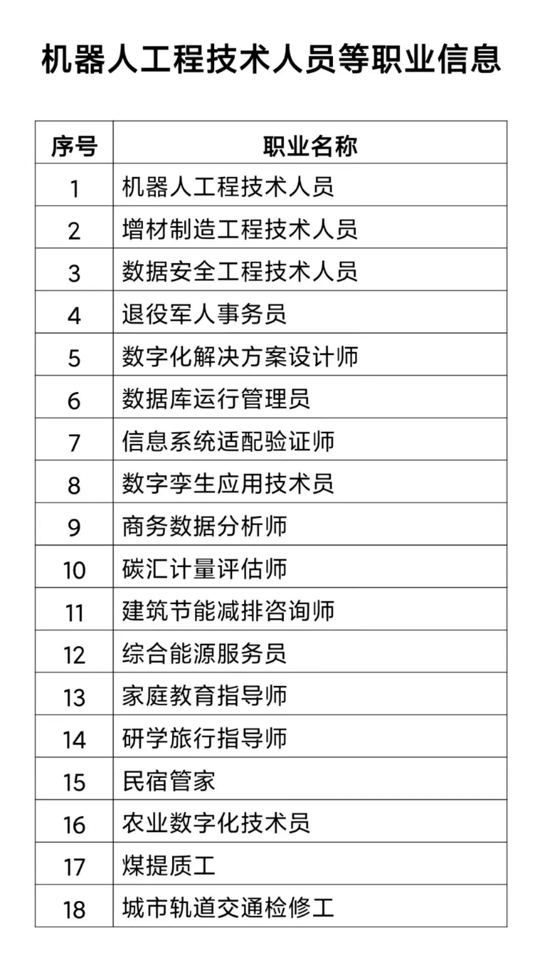 2021年4月,人力资源社会保障部、国家市场监督管理总局、国家统计局联合启动对《中华人民共和国职业分类大典(2015年版)》(以下简称大典)的修订工作。经向社会公开征集修订建议、组织专家评估论证、书面征求行业部门意见等程序,大典修订工作已基本完成。为全面、客观、如实、准确反映当前社会职业发展实际状况,拟将新职业信息纳入新版大典。同时,为促进青年特别是大中专毕业生就业创业工作,近期,人力资源社会保障部将向社会公示相关新职业信息,其中机器人工程技术人员等18个新职业信息作为第一批向社会进行公示,广泛征求意见。此次公示的新职业具有以下几个特点: