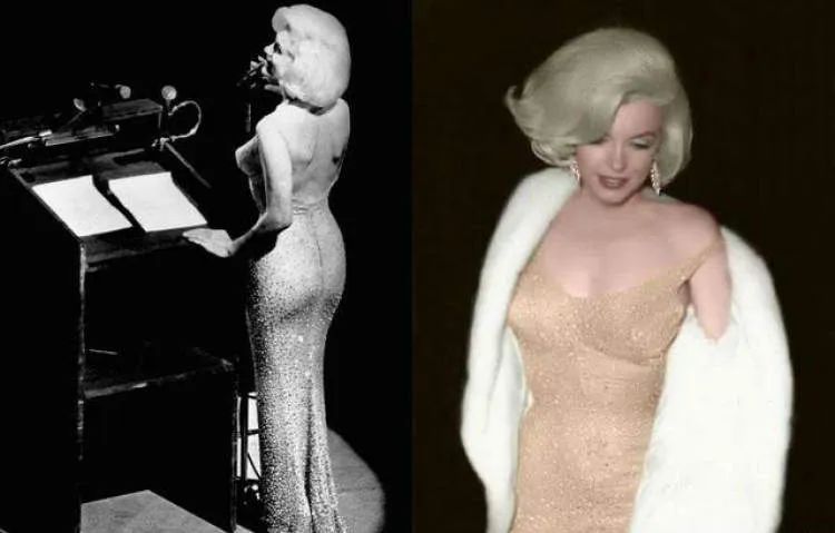 这件礼服很有来头,是梦露在1962年替美国前总统肯尼迪献唱生日快乐歌时所穿,距今已经有60年的历史。2016年,礼服拍卖成交价480万美元,是相当珍贵的古董。不过,它的意义不止如此,关键在于是梦露先穿进去最后缝合而成的,所以整条裙子跟梦露本人浑然一体。