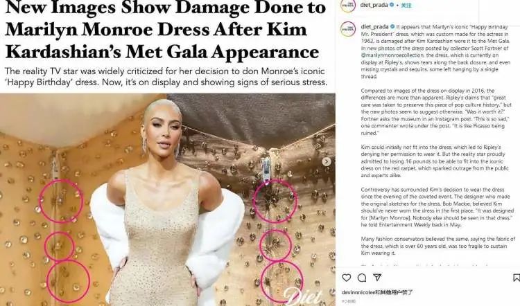 谁料想百密一疏,礼服送还给博物馆后,出现了明显撑坏的痕迹,部分装饰水钻也脱落,引发了“The Marilyn Monroe Collection”组织的不满,更让网友们纷纷发文声讨。