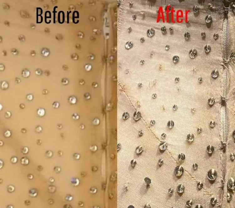 该组织透过社交平台发出对比照,指出礼服臀部拉链周围的水钻松脱,有好几个地方甚至只剩线头,以及拉链周围的布料也有因用力拉扯或硬撑导致的破损。