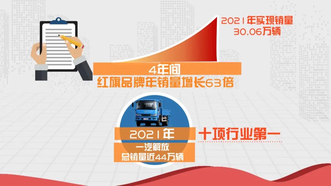 63倍。短短4年间,红旗品牌年销量增长63倍, 2021年实现销量30.06万辆;2021年,一汽解放总销量近44万辆,勇夺十项行业第一。