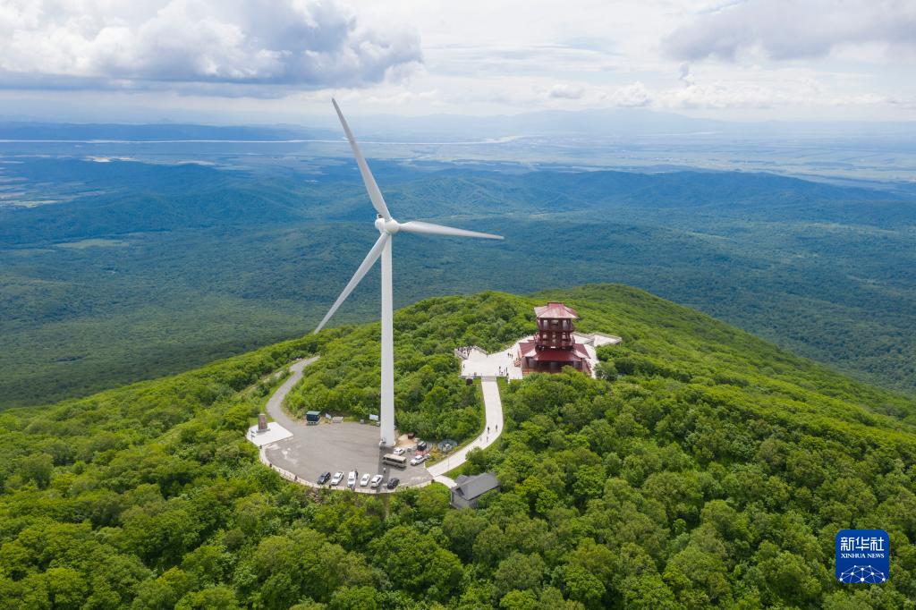 6月19日拍摄的黑龙江饶河大顶子山森林公园风光(无人机照片)。夏日时节,位于黑龙江省饶河县的大顶子山森林公园上空白云飘荡,景色宜人。新华社记者 谢剑飞 摄
