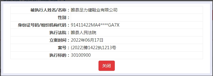 中新经纬6月20日电 中国执行信息公开网显示,睢县足力健鞋业有限公司(下称“睢县足力健”)新增一条被执行人信息,执行标的3010.09万,执行法院为睢县人民法院。