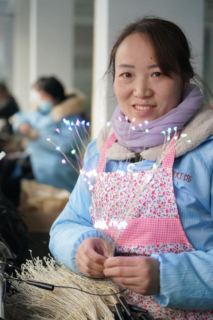 在安康市白河县城关镇安坪社区一家灯饰社区工厂内,工人马友梅在展示制作的产品(2月22日摄)。新华社记者邵瑞摄