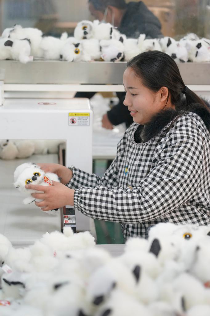 安康市汉滨区五里镇朝阳社区一家新社区工厂生产的毛绒玩具产品(2月22日摄)。新华社记者邵瑞摄