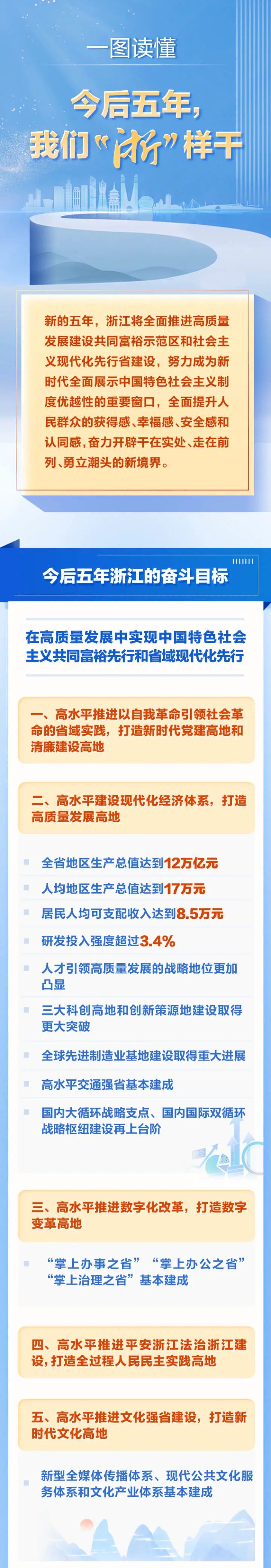 新的五年,浙江将全面推进高质量发展建设共同富裕示范区和社会主义现代化先行省建设,努力成为新时代全面展示中国特色社会主义制度优越性的重要窗口,全面提升人民群众的获得感、幸福感、安全感和认同感,奋力开辟干在实处、走在前列、勇立潮头的新境界。